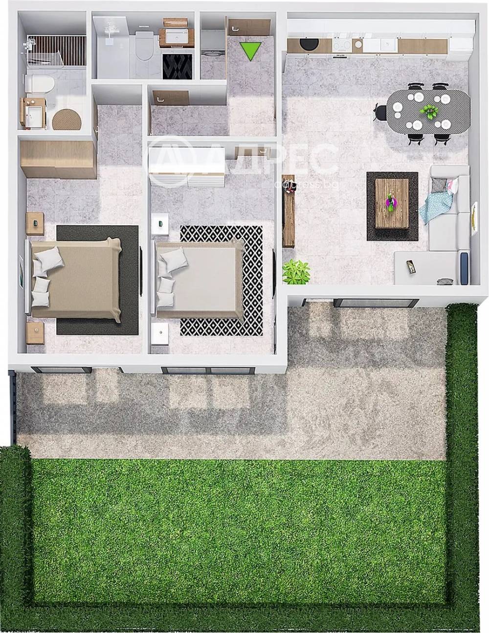 Дворно място:44,08 m? , Жилището се състои от хол с кухненски бокс, две спални , две санитарни помещения, веранда и дворно място. Към жилището има прилежащи две парко места на цена от 17 000 евро всяко.