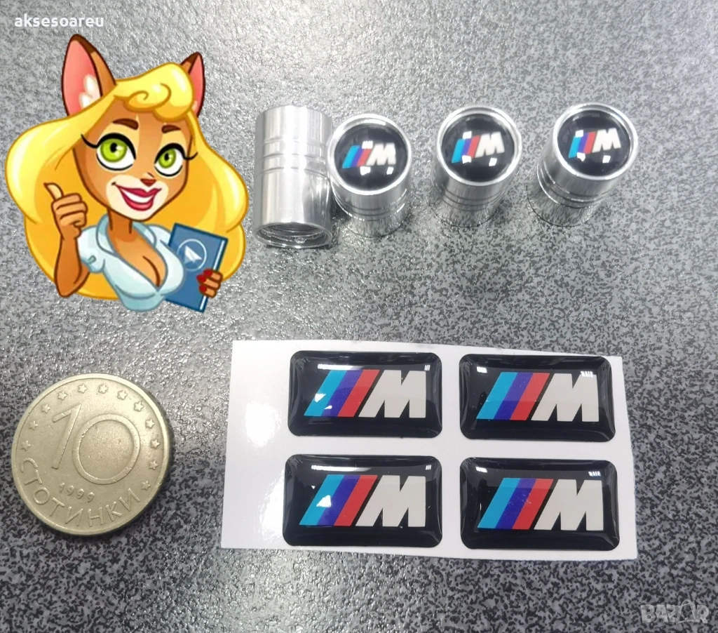 Нов качествен комплект 4 бр. стикери за BMW M Performance + 4 бр. капачки за вентили на гуми за