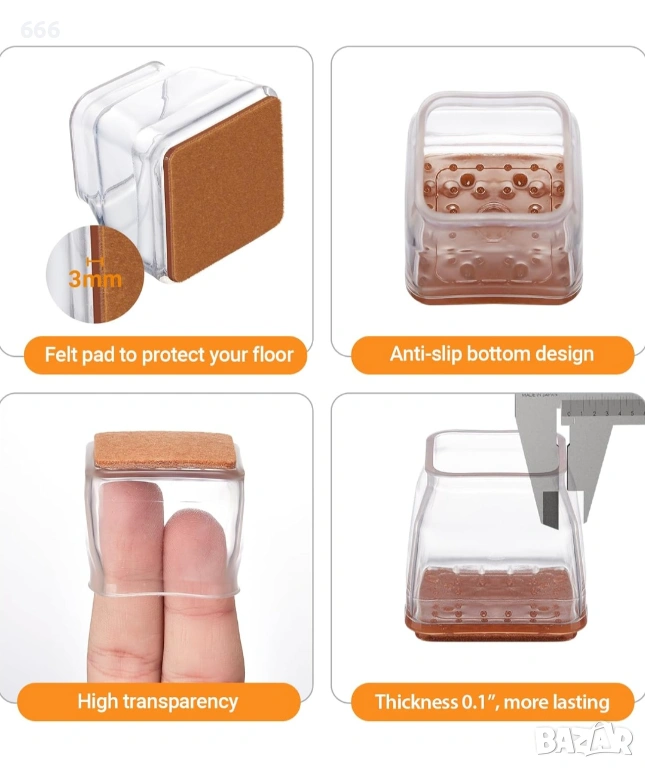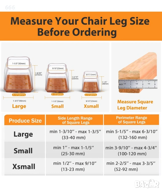 ПРИЛОЖИМИ ФОРМИ И РАЗМЕРИ: Нашите протектори за под на краката на столове са подходящи само за дървени квадратни крака на столове. В сравнение с капачките за кръгли крака на столове, протекторът за под на квадратни крака на стол пасва по-добре на квадратните крака на стола. Предлагаме протектори за крака на столове в три размера за дървени подове. Моля, измерете размера на крачетата на мебелите си преди покупка. Протекторите за под на квадратни крака с размер L са подходящи за квадратни крака с дължина на страната от 1-3/10" до 1-3/5" (33-40 мм), неправилни крака с периметър от 5-1/5" до 6-3/10" (132-160 мм).