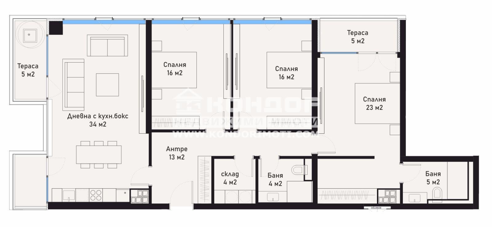 Жилището което ви предлагаме е многостаен апартамент състоящ се от посторна и добре осветена дневна с трапезария и кухненска част - 34 кв.м. , с излаз на хубава тераса, три самостоятелни спални, едната от които със собствен санитарен възел гардеробна, баня с тоалетна, килер/перално помещение, широко входно антре с място за гардероб.