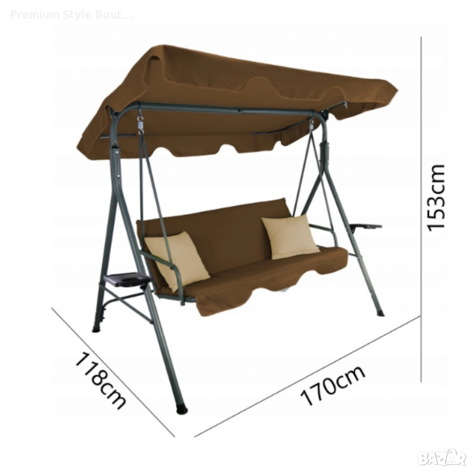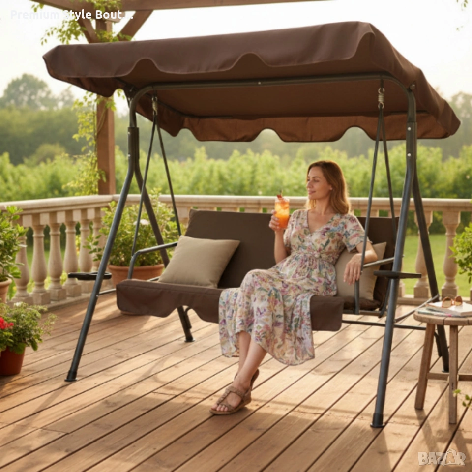 Градинска люлка A-Type с бежови възглавници - елегантност и комфорт Техническите данни гарантират надеждност и сигурност при ползване: Размери: 170 × 118 × 153 см Дебелина на профила: 38 мм (конструкция), 25 мм (седалка) Конструкция: прахово боядисана стомана Материал на покритието: водоустойчив полиестер 140 г/м² Седалка: 600 × 300D Оксфорд Пълнеж: 5 см дунапрен Възглавници: 2 бежови възглавници, подвижни Окачване: пружинно за стабилно люлеене Сенник: регулируем с копче, наклон до 45° Оборудване: 2 пластмасови поставки за чаши, крайни капачки Максимално натоварване: 220 кг (предназначение: 2–3 души) Доставка с Еконт с опция преглед. Не са налични! Ще се поръчат след като се съберат 10 поръчки за артикула.