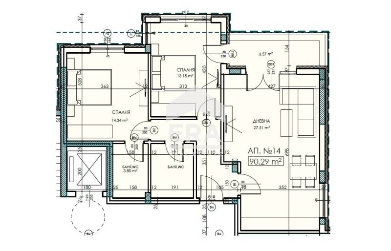 Предлаганият апартамент 14 се намира на трети жилищен етаж с двустранно изложение запад/ север. Има площ 107.35 кв.м., от които чистата такава е 93.69 кв.м. и има следното разпределение: всекидневна с кухненски бокс и трапезария 27.51кв.м., спалня 14.34 кв.м., втора спалня 13.15 кв.м., баня с тоалетна с площ 3.79 кв.м., втора баня с тоалетна, антре, тераса лоджия с площ 6.57 кв.м.