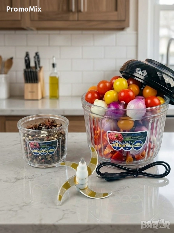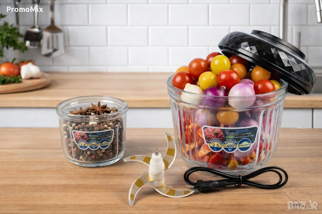 - Чопър със стъклен съд и капацитет: 2.5 л