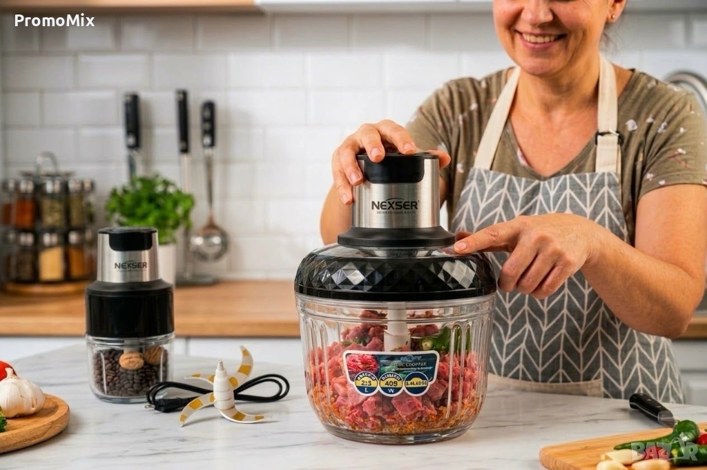 Nexser NS 0819 е кухненски уред 2в1, който комбинира функциите на чопър и мелничка, с мощност 400 W и 2 степени на работа.