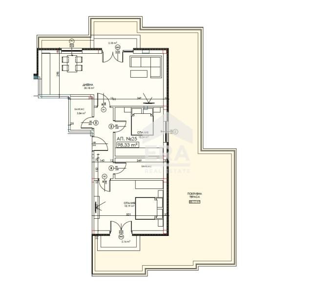 Предлаганият апартамент 25 се намира на четвърти последен жилищен етаж с тристранно изложение изток/ запад/ север. Има площ 112.67 кв.м., от които чистата такава е 98.33 кв.м. и има следното разпределение: всекидневна с кухненски бокс и трапезария 30.18 кв.м., спалня 18.19 кв.м., втора спалня 12.24 кв.м., баня с тоалетна, втора баня с тоалетна, антре, две тераси с площ 2.18 кв.м. и 2.16 кв.м., както и покривна тераса, която е с площ 88.12 кв.м.