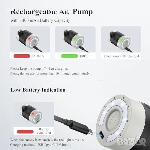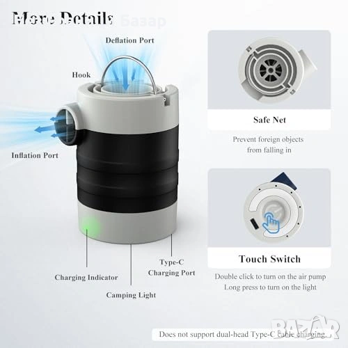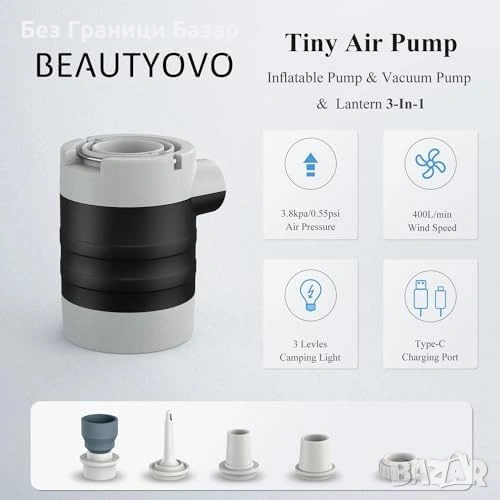 Компактна електрическа помпа 3 в 1: надуване, изпускане и къмпинг осветление