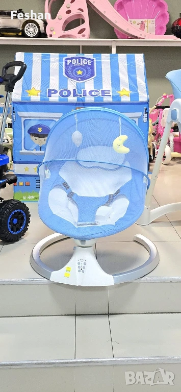 Получих го като подарък, но ние си бяхме купили такъв.Има люлеещ механизъм с 5 степенни,Муза няколко наброй и дистанционно.Пробван е само веднъж и е в много добро състояние.