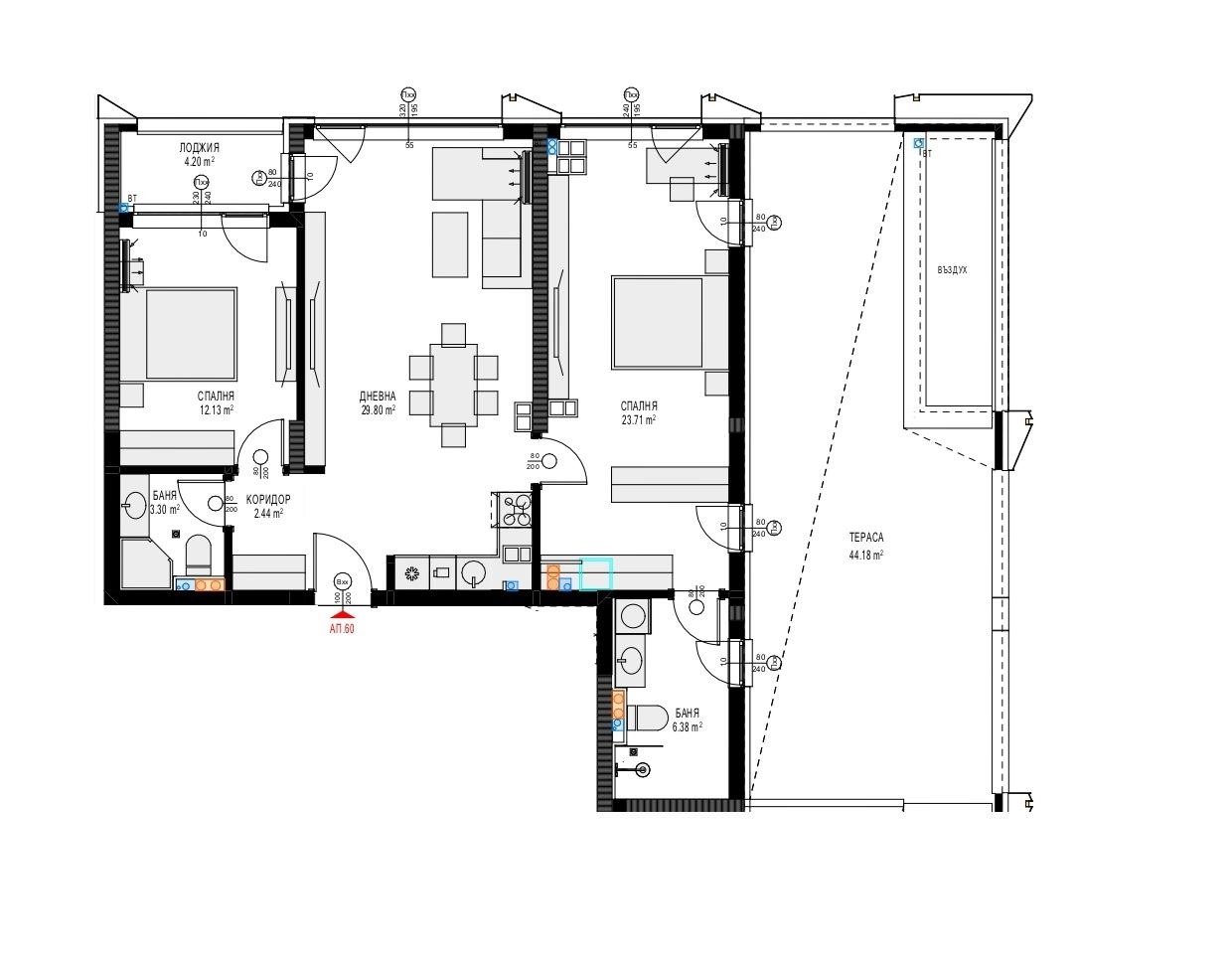 Имотът се състои от входно антре, 30,00 кв.м.просторна дневна, френски прозорци , спалня с баня и лоджия към нея и още една спалня от 24 кв.м. с баня 6 кв.м. и открита тераса.