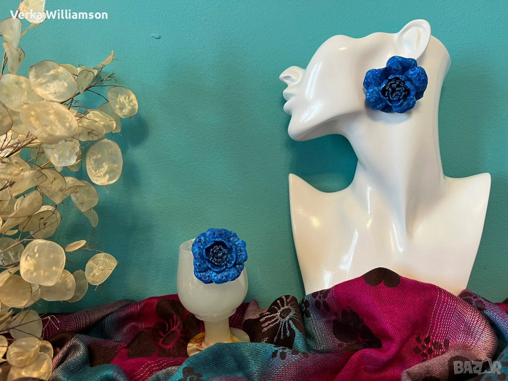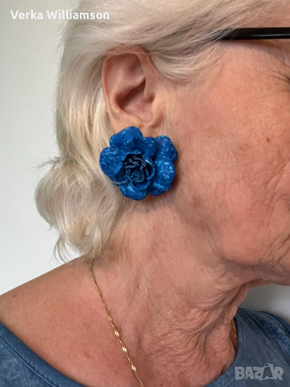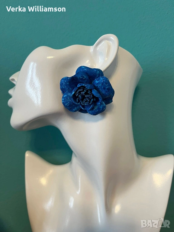 Сини обици от естествена кожа ръчна изработка. Бъбрековидна метална закопчалка.Ръчно рисувани.Диаметър: 4 см.