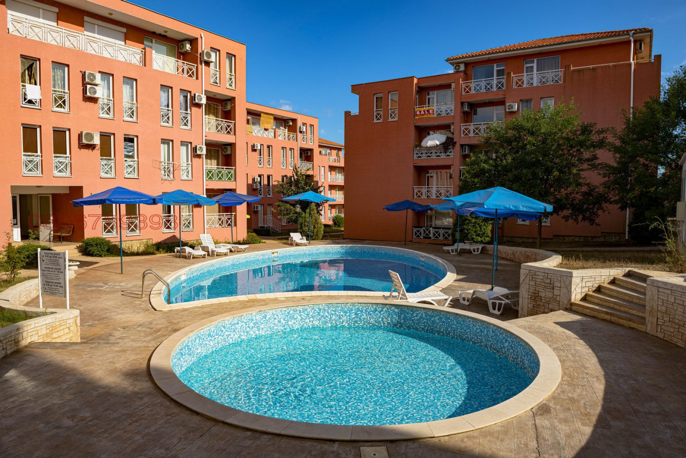 Модерен комплекс с басейни 5 на брой, воден бар, тенис корт , футболно игрище , баскет игрище , миниголф , детски кът , ресторант , хранителен магазин ,охраняем паркинг с бариера с включено паркомясто , поддържан огромен озеленен двор !