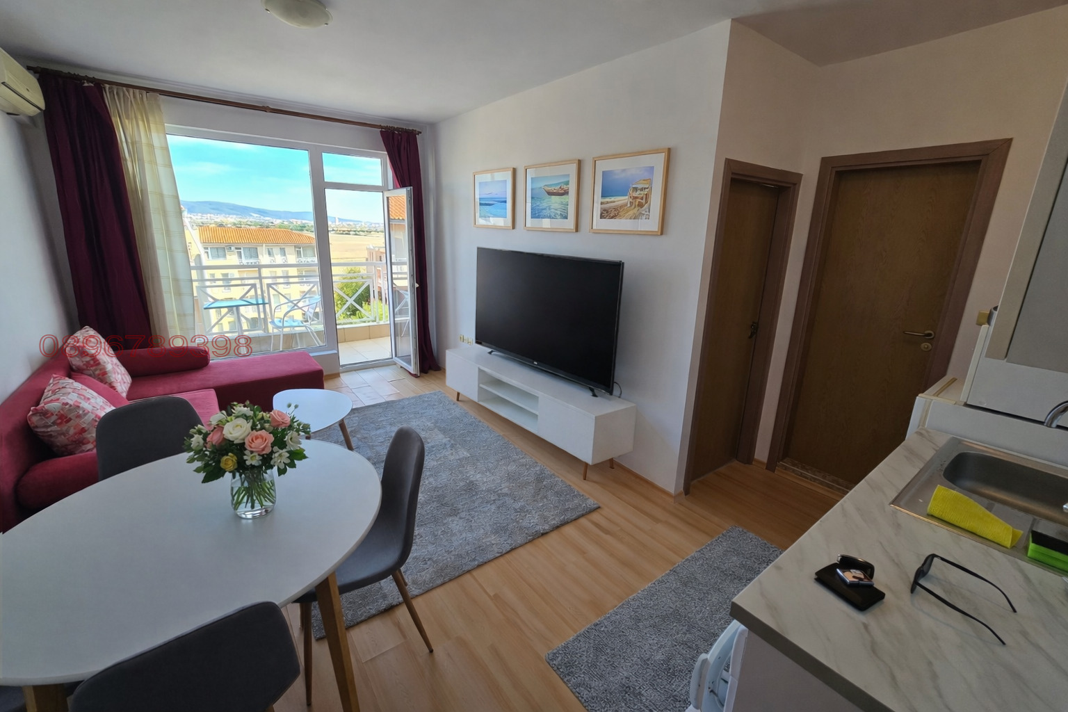 Всекидневна с кухненски бокс с разтегателен диван и огромен тлевизор , голяма спалня , банята с душ , голям балкон с място за релакс ! Максимаелн капацитет от 4 човека.