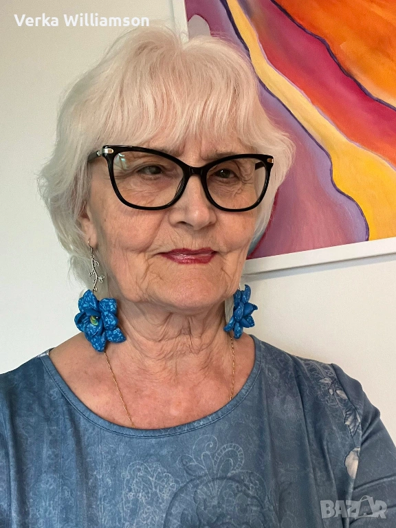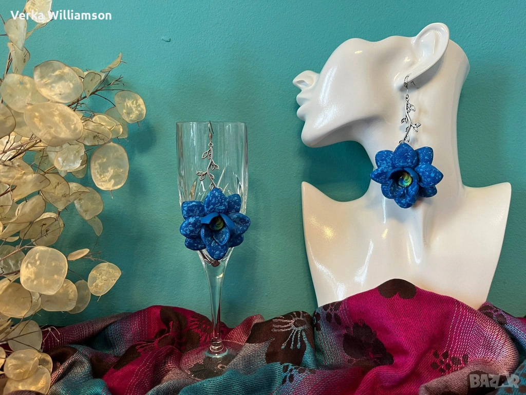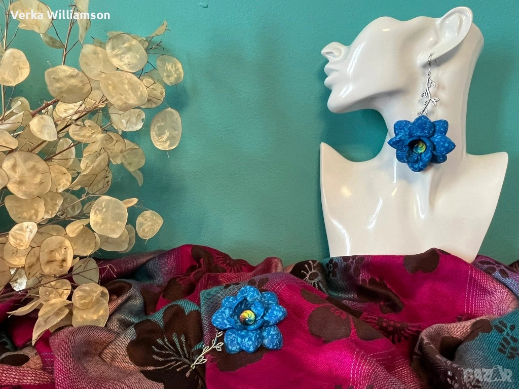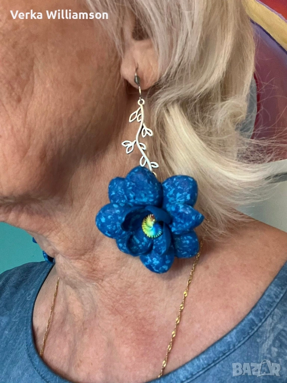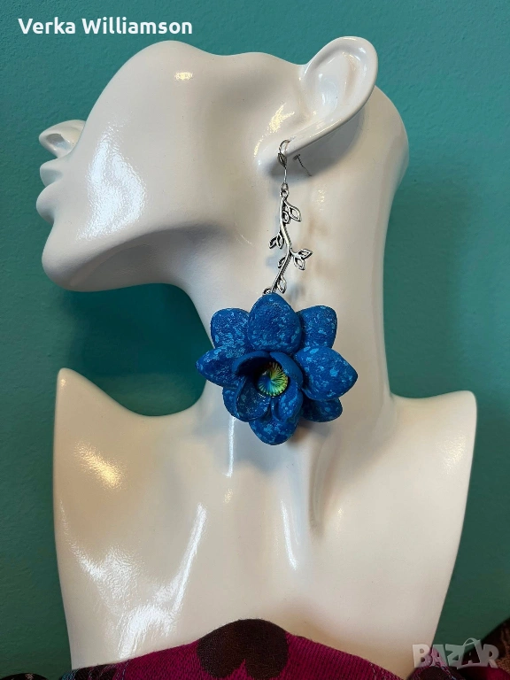Сини ръчно изработени висящи обици от естествена кожа и метален декоративен елемент в сребристо. Ръчно рисувани.Дължина на обицата: 10,5 см.Диаметър на цветето: 5,8 см.