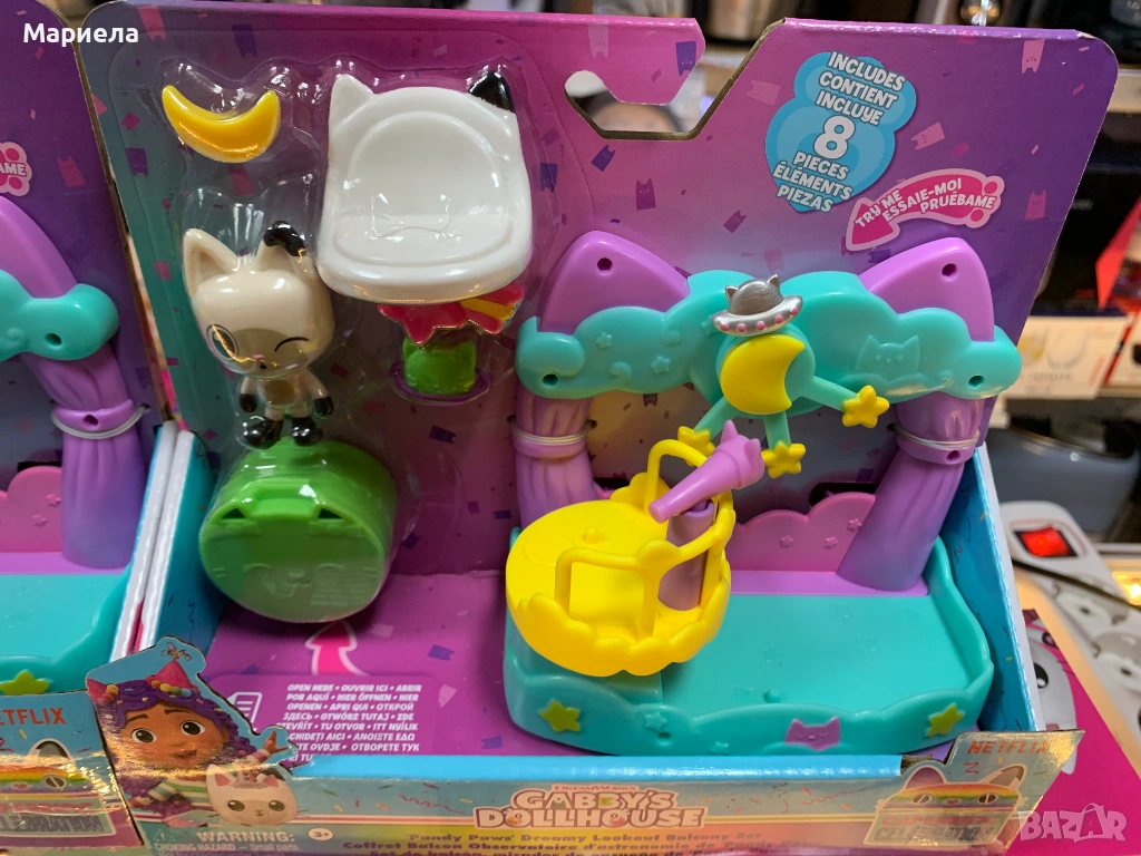 Потопете се в магическия свят на Gabby’s Dollhouse с комплекта за игра „Pandy Paws Dreamy Lookout Balcony“. Включва фигурка на Pandy Paws с височина 6,3 сантиметра, кукленска мебел и 6 аксесоара за куклена къщичка, сред които телескоп и украшения за балкон. Закачете балкона на прозорците на куклената къщичка, след което разопаковайте кутията за доставки, за да откриете изненадващата играчка – висулка поничка. Сканирайте QR кода върху кутията за доставка, за да отключите специална награда в безплатното приложение Gabby’s Dollhouse, достъпно за iOS и Android.
