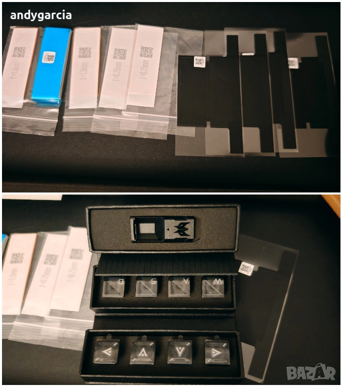комплект резервни бутони W,A,S,D + 4те стрелки + инструмент за подмяна в специална кутия при зарядното.MagKey 4.0 за прецизен контрол, механични превключватели.