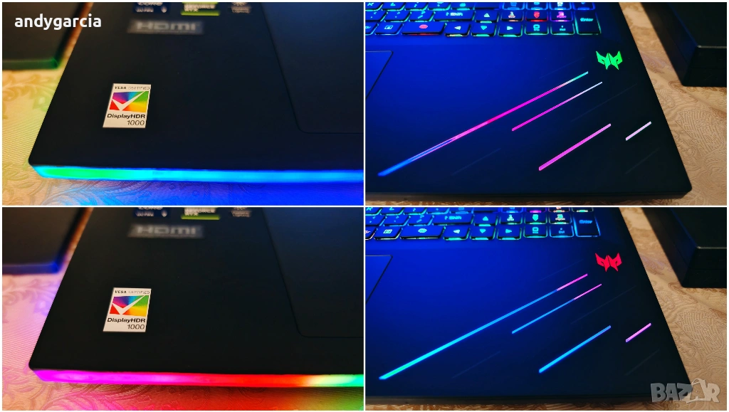 - клавиатура с RGB подсветка + RGB светещо лого на металния капак и в задната част при отворите за въздух + RGB светеща лента вляво и RGB лого и черти вдясно на палмреста.