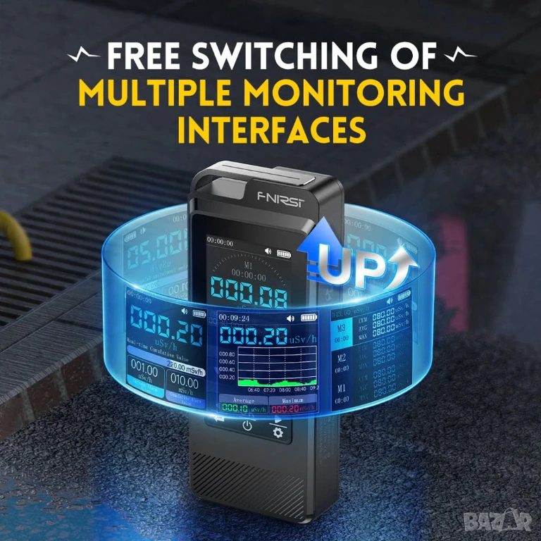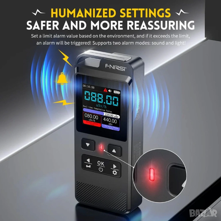 Моделът е оборудван с IPS LCD дисплей, който визуализира текущи, средни, максимални и натрупани стойности на радиацията. Потребителят може да задава алармени прагове, като устройството предупреждава чрез звуков и светлинен сигнал при превишаване на безопасните нива.