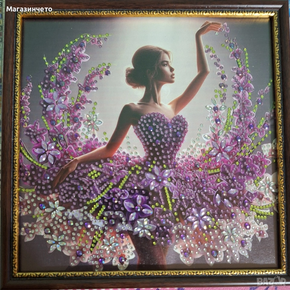 Елегантност и блясък в едно! Тази картина изобразява балерина в прелестна лилава рокля, изработена от хиляди блестящи елементи. Прекрасно допълнение към модерен интериор.