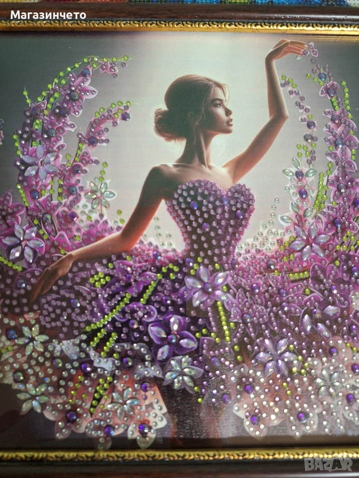 Елегантност и блясък в едно! Тази картина изобразява балерина в прелестна лилава рокля, изработена от хиляди блестящи елементи. Прекрасно допълнение към модерен интериор.