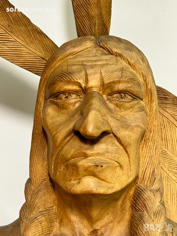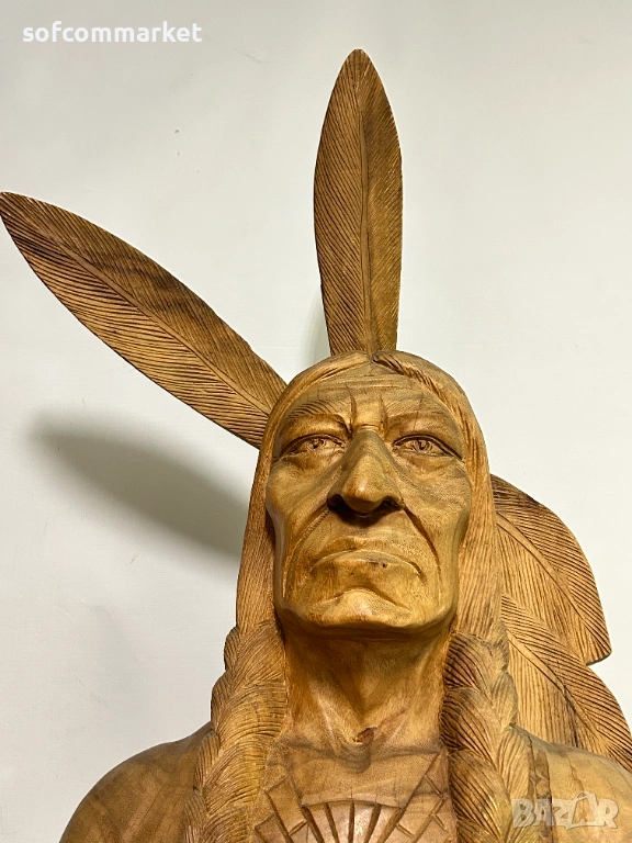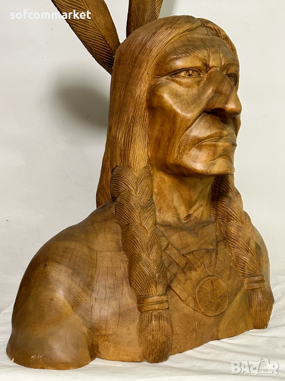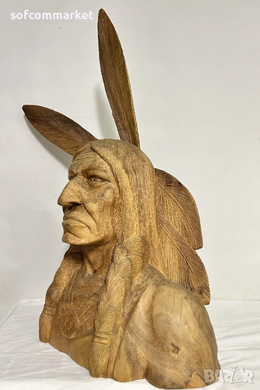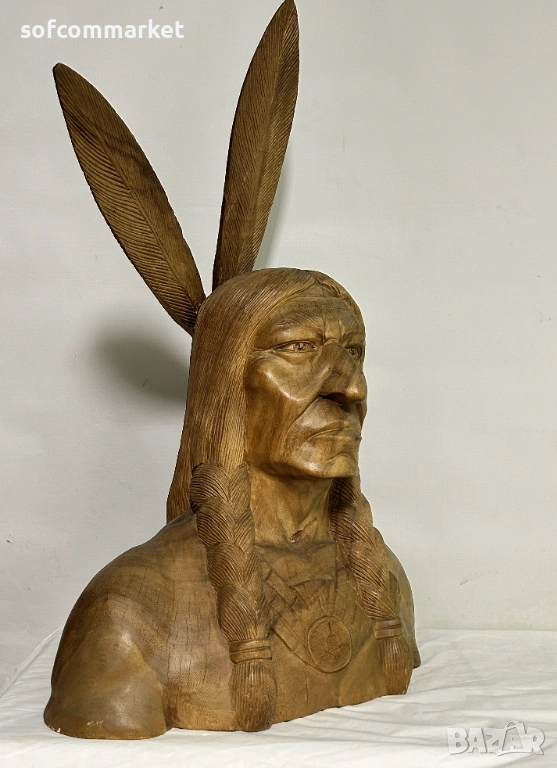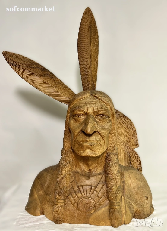 Продавам масивна дървена скулптура (бюст) на индиански вожд. Ръчна изработка, която предава детайли и характер. Подходяща за декорация на интериор, хол, кабинет, механа или заведение.