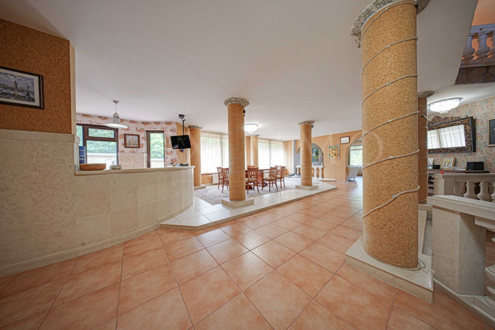 Първи етаж: фоайе, уютна дневна с камина, трапезария, кухня и спалня, баня;