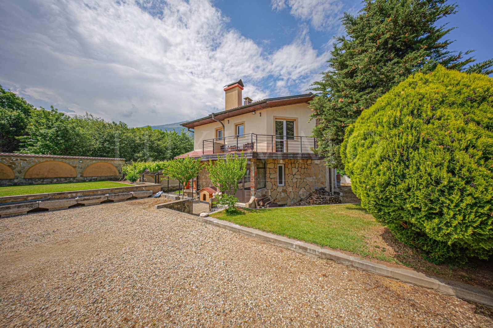 Къщата е организирана на три надземни нива, с благоприятно южно изложение и богата естествена светлина. От широката тераса се открива панорамна гледка към планината истинско усещане за уединение, без да се губи връзката с града.