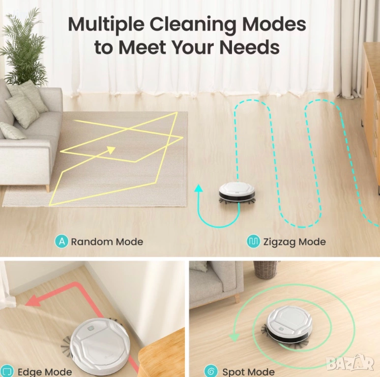 6 режима на почистване : роботът предлага шест режима на почистване: автоматично почистване, почистване на място, почистване на ръбове, почистване на зигзаг, програмирано почистване и ръчно почистване. Превключвайте между режимите и регулирайте нивата на мощност с помощта на приложението Lefant. Забележка: Избягвайте да използвате режим Зигзаг върху килими.