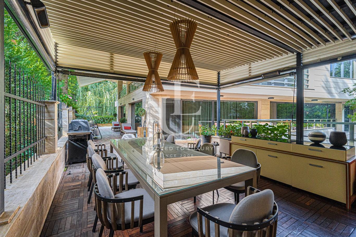 Тераси с ролетни щори, осигуряващи комфорт и уединение през всеки сезон.