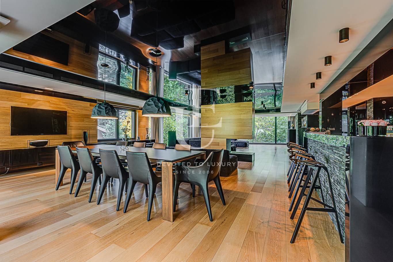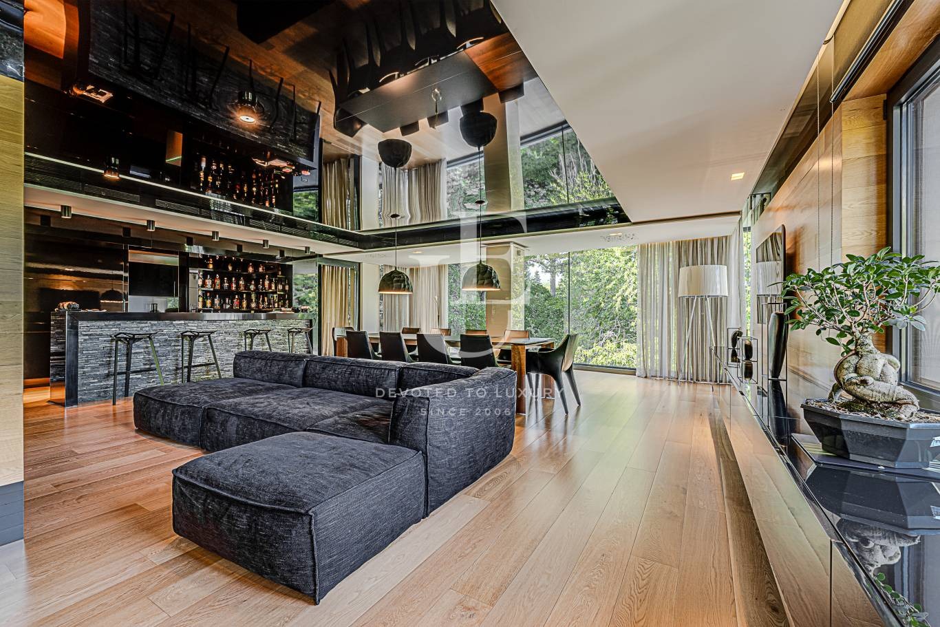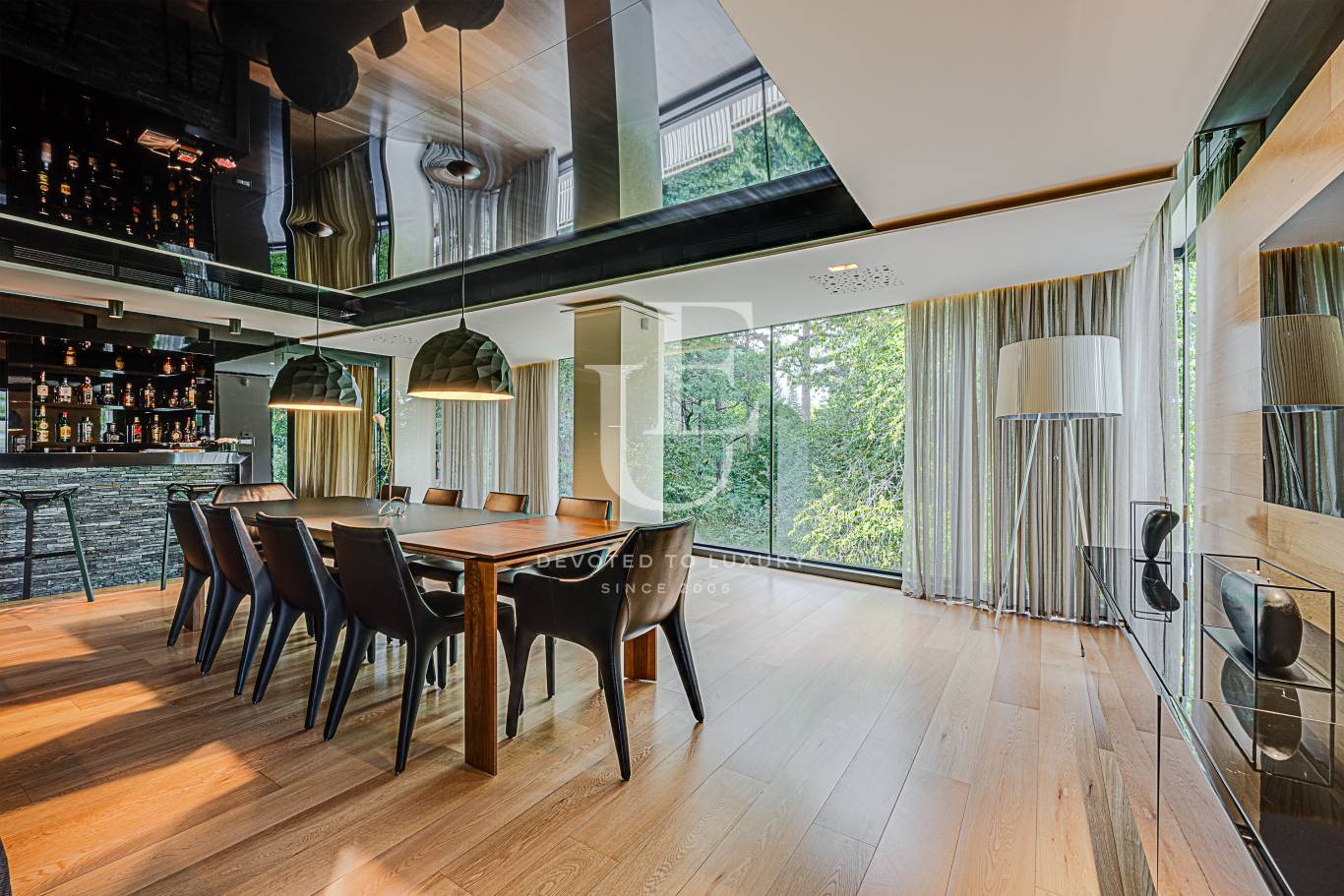 Огромна дневна с трапезария, отделна кухня, бар зона, тоалетна за гости. Пет спални, четири бани с тоалетни, гардеробни.
