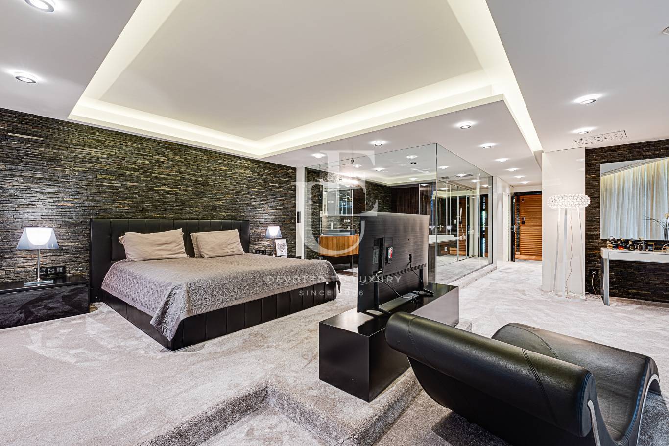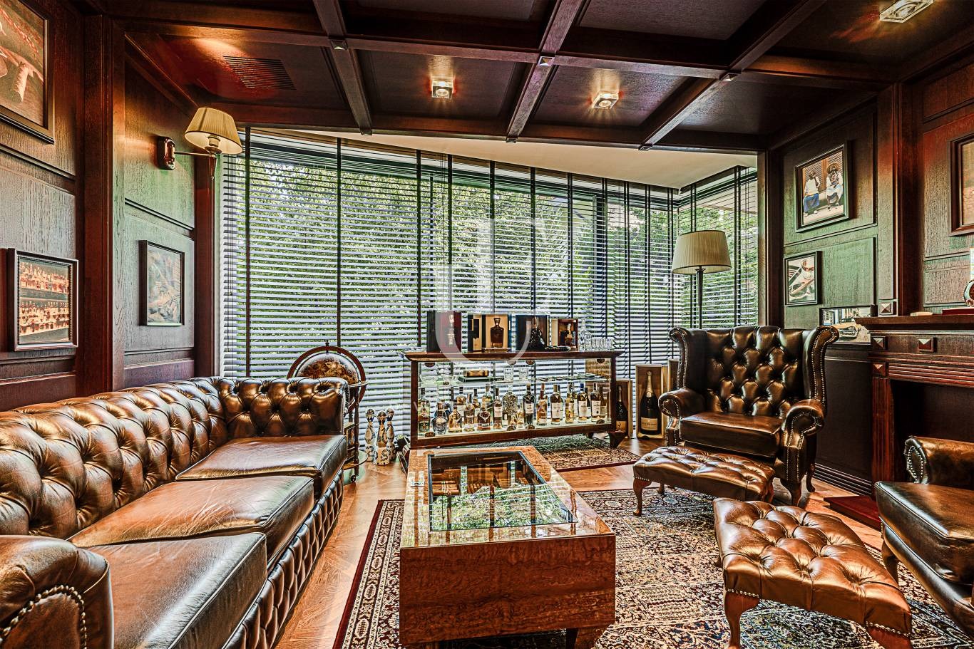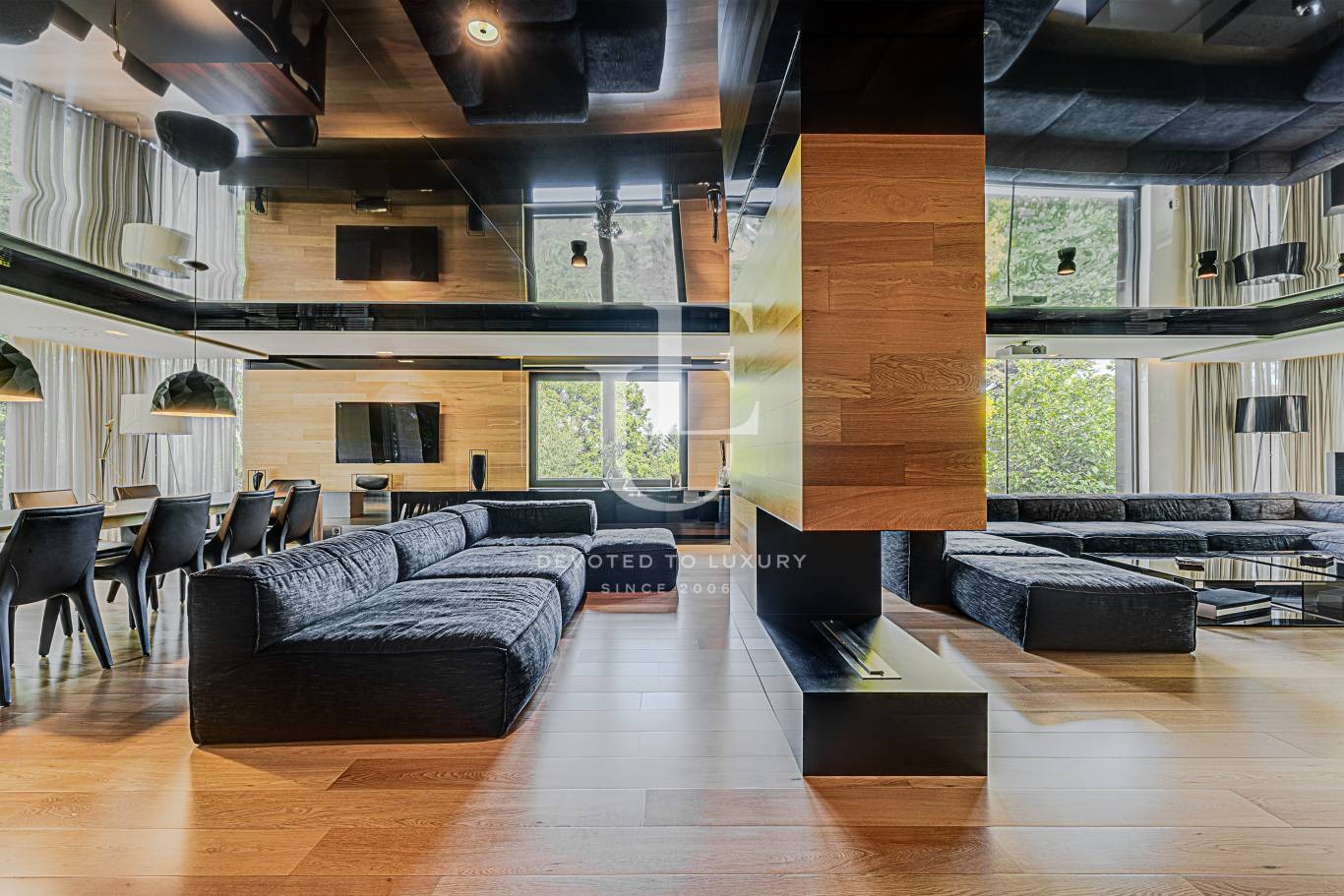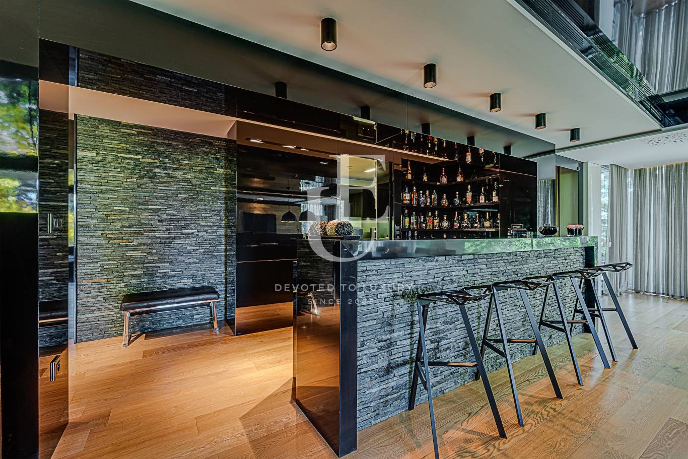 Огромна дневна с трапезария, отделна кухня, бар зона, тоалетна за гости. Пет спални, четири бани с тоалетни, гардеробни.