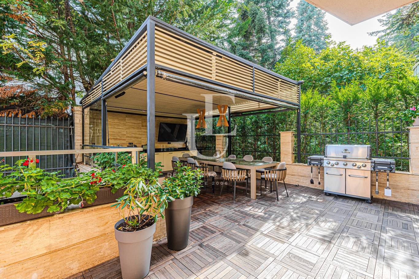 Електроуреди на 'Miele', осветителни тела 'FLOS'. Всичко в имота е с италиански мебели от най-висок клас на 'Minotti' и 'Bonaldo', трислоен паркет от дъб.