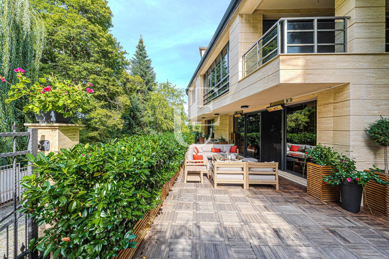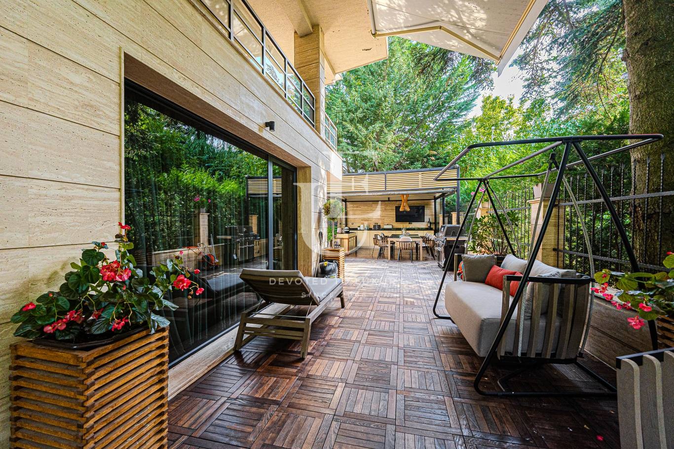 Двор, озеленен и аранжиран с италиански градински мебели 'ETHIMO' и е разпределен на три къта за наслада: