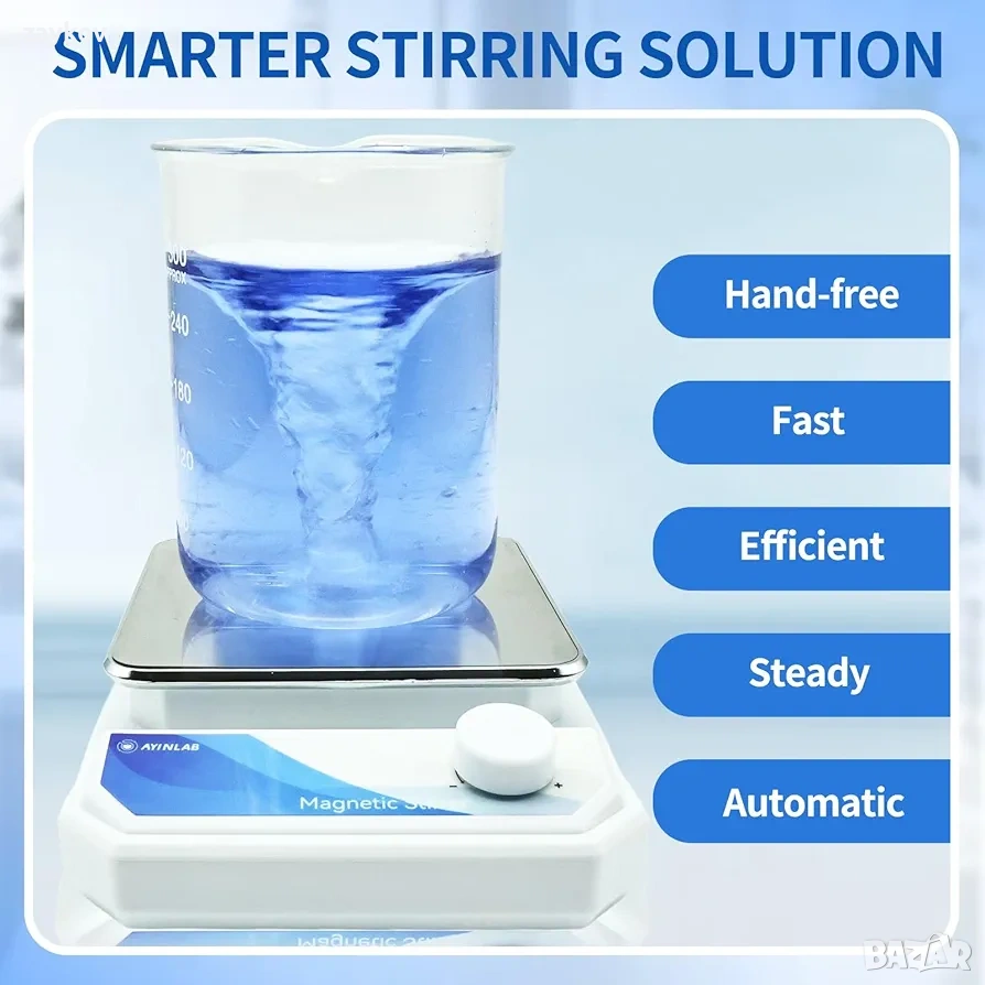 Широки приложения: Идеален за разнообразни приложения в химията, лабораториите, биологията, малкия бизнес, дома и кухнята. Перфектен за смесване на закваски, домашно пивоварство, студено приготвено кафе, напитки, дегустация на вино, хранителни добавки, етерични масла; тераси, глазури, подглазури, керамика; измиване на отпечатъци от смола в IPA; разтвори за дозиране на аквариуми, структурирана вода, растителни торове, течни култури от гъби, „Направи си сам“ проекти и много други.