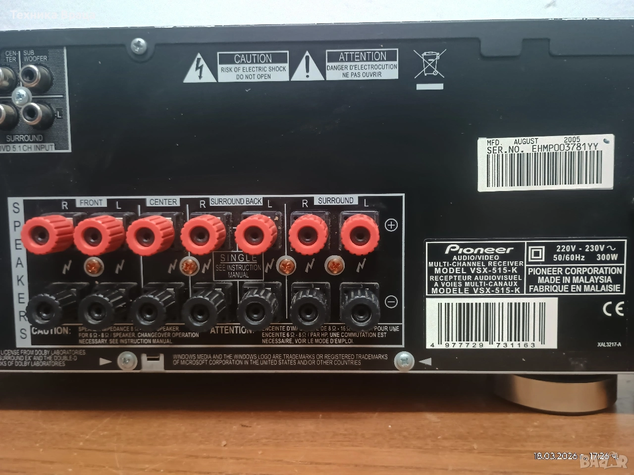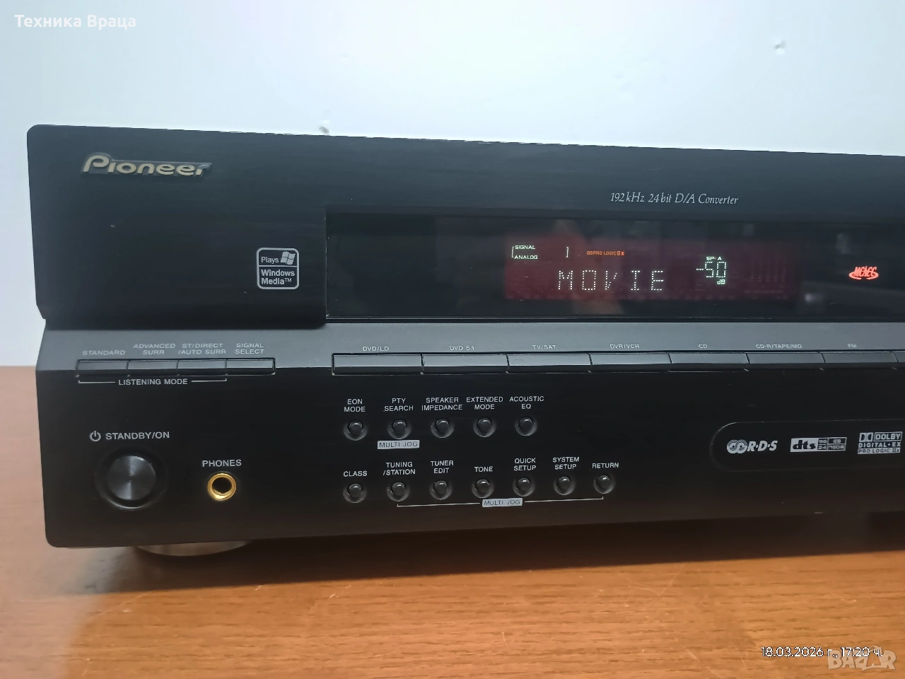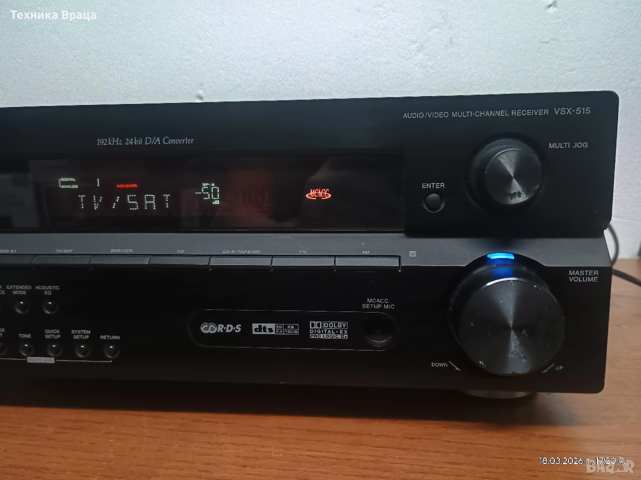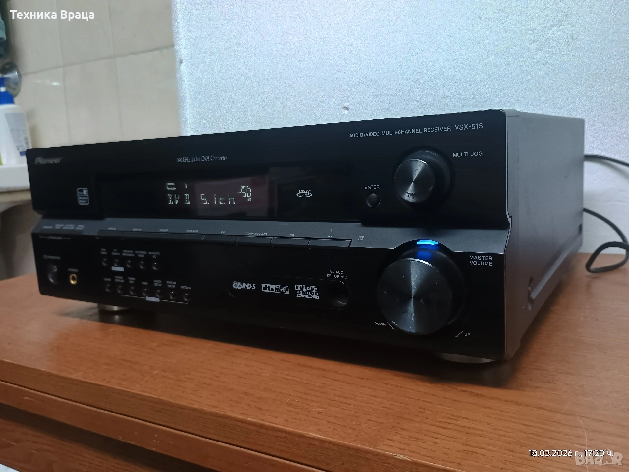 Pioneer VSX-515-K в перфектно техническо и много добро външно състояние с няколко дребни козметични забележки. Това е 6.1-канален аудио-видео приемник за домашно кино и аудио, проектиран да предлага мощно съраунд аудио изживяване със своите 110W RMS при 8ohm на канал!!! Разполага с много настрийки и режими на звука, който от своя страна е с наистина високо качество. Основни технически характеристики Канали и мощност: Системата е 6.1-канална с обща изходна мощност от 660W (110W на канал при 8 ома). При 6 омови тонколони мощността е около 130 вата на канал. Аудио декодери: Поддържа широк набор от формати, включително Dolby Digital EX, DTS-ES (Discrete и Matrix), Dolby Pro Logic IIx, DTS 96/24 и Windows Media Audio 9 Professional. Обработка на звука: Разполага с 24-bit/192kHz аудио цифрово-аналогов преобразувател (