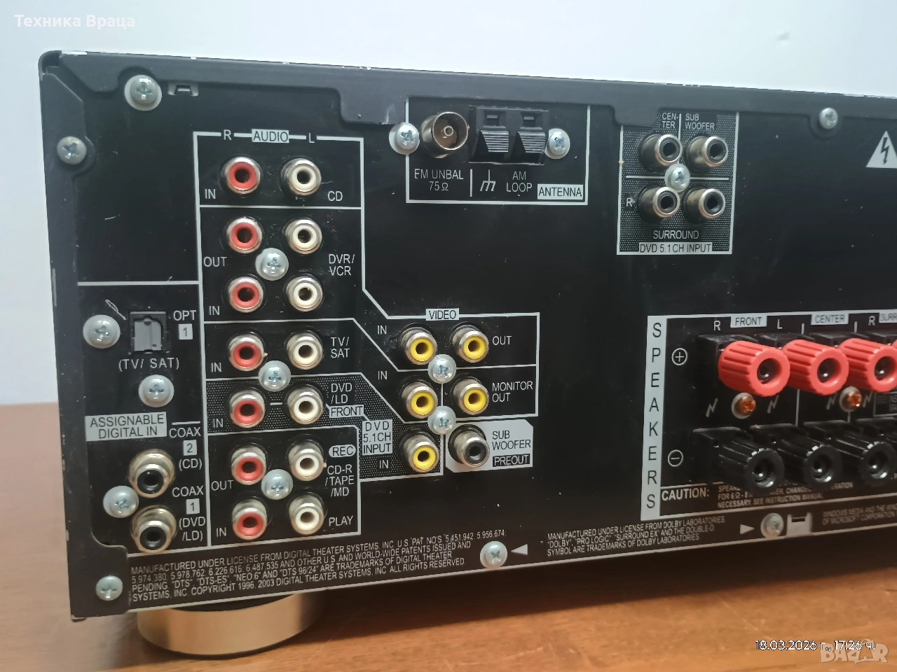 DAC) и 9 усъвършенствани режима за съраунд звук (като Movie, Music, Game, Sports). Свързаност: Видео: Включва 2 компонентни видео входа и 1 изход, както и S-Video входове/изходи. Аудио: Разполага с 3 цифрови входа (2 коаксиални и 1 оптичен) и 5.1-канален вход за външни декодери. Радио тунер: Вграден AM/FM тунер с памет за 30 станции. Предимства и недостатъци Предимства: Стабилно качество на звука за ценовия си клас, поддръжка на 6.1 канала и наличие на компонентни видео входове. Тегло ~10кг.