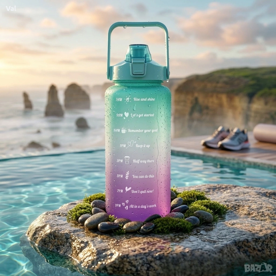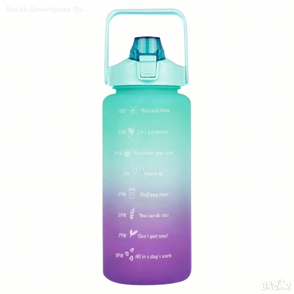 Капацитет: 2000 мл (2 л) Материал: PP + PC Без BPA: Да Мундщук със сламка: Да, сменяема Широк отвор: Улеснява пълненето и почистването Дръжка: Да, удобна за носене Затваряне: Плътно, непропускливо Маркировки: Времеви маркери и мотивиращи надписи Цвят: Зелено-лилав градиент Поддръжка: Препоръчва се ръчно пране за съхраняване на отпечатъците и декоративните надписи