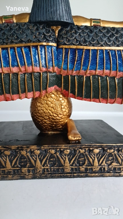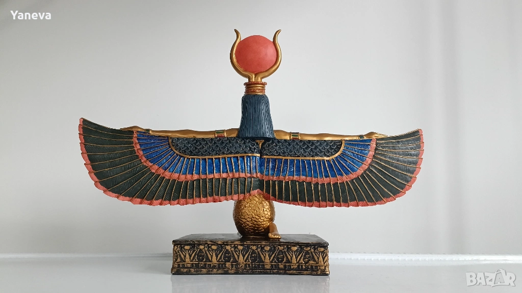 Крилата и са разперени в знак за защита и закрила , има слънчев диск между рога на главата – символ на връзката ѝ със слънцето и божествената сила. Размер 33 см, цена 60 €. Нова, внос от Египет.
