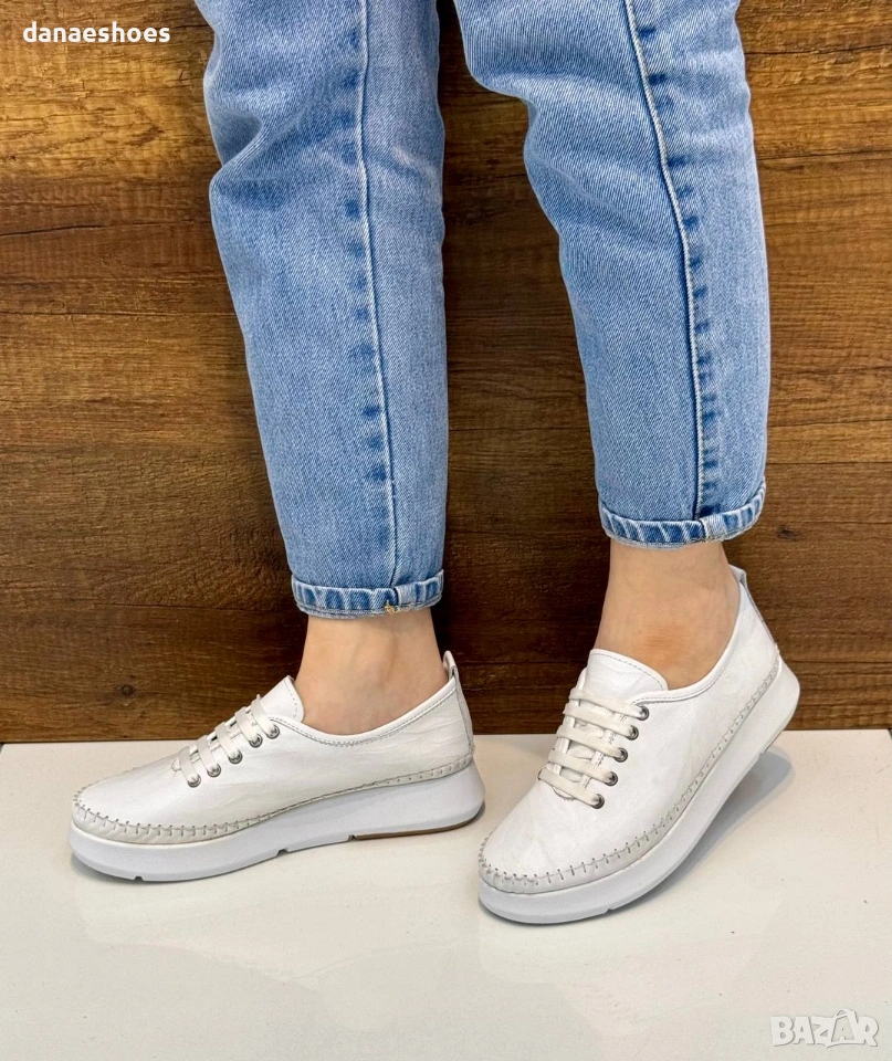 Олекотени дамски обувки с връзки от много мека естествена кожа в бяло. Анатомична подметка, стелка от естествена кожа, гъвкава подметка. Модела е изключително удобен за ежедневие и дълги разходки. Номерация 36-40.