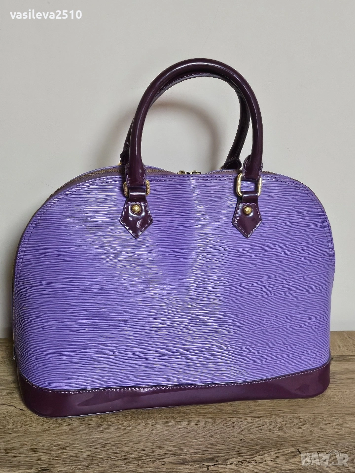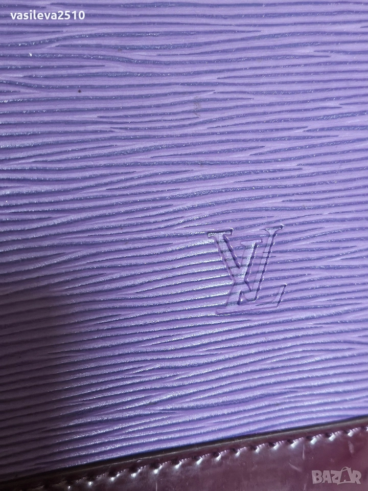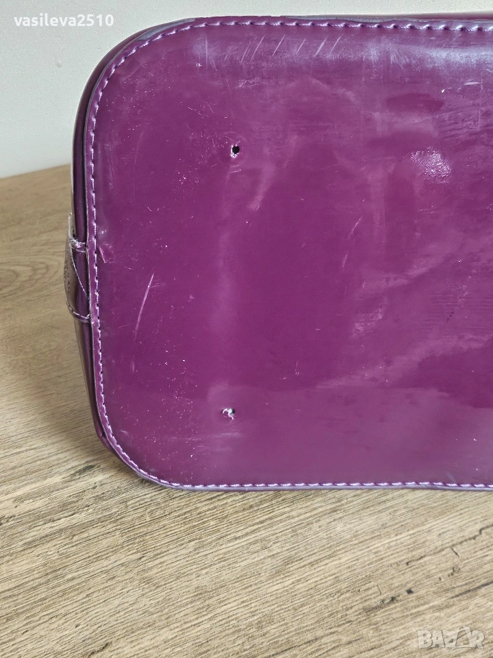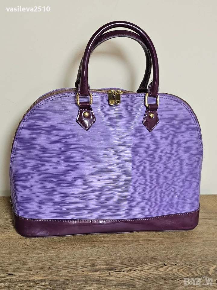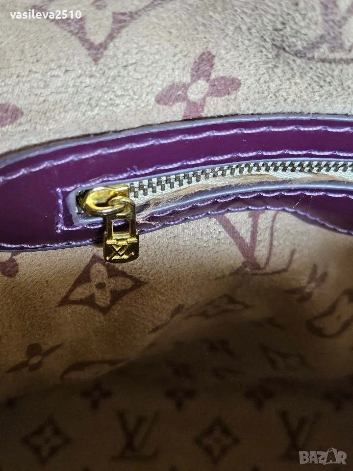 Louis Vuitton дамска винтидж чанта кожата е естествена, основния цвят е лилав в долната част е тъмно лилава, там е естествен лак, отвътре плюшен хастар.
