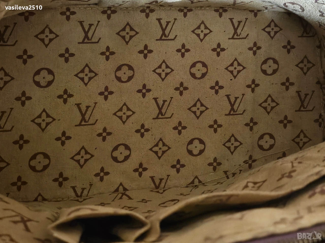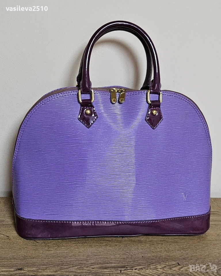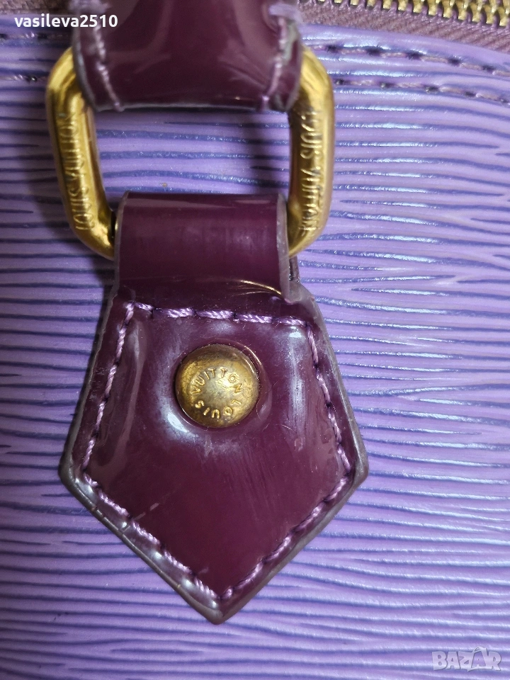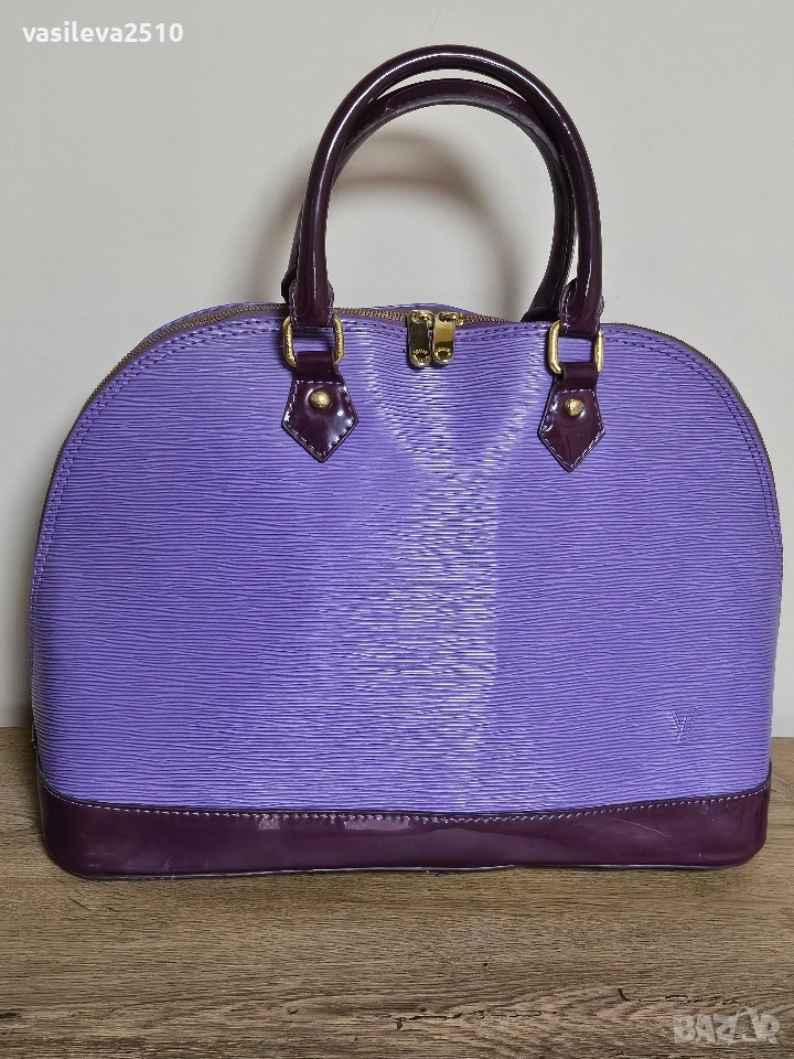 Louis Vuitton дамска винтидж чанта кожата е естествена, основния цвят е лилав в долната част е тъмно лилава, там е естествен лак, отвътре плюшен хастар.