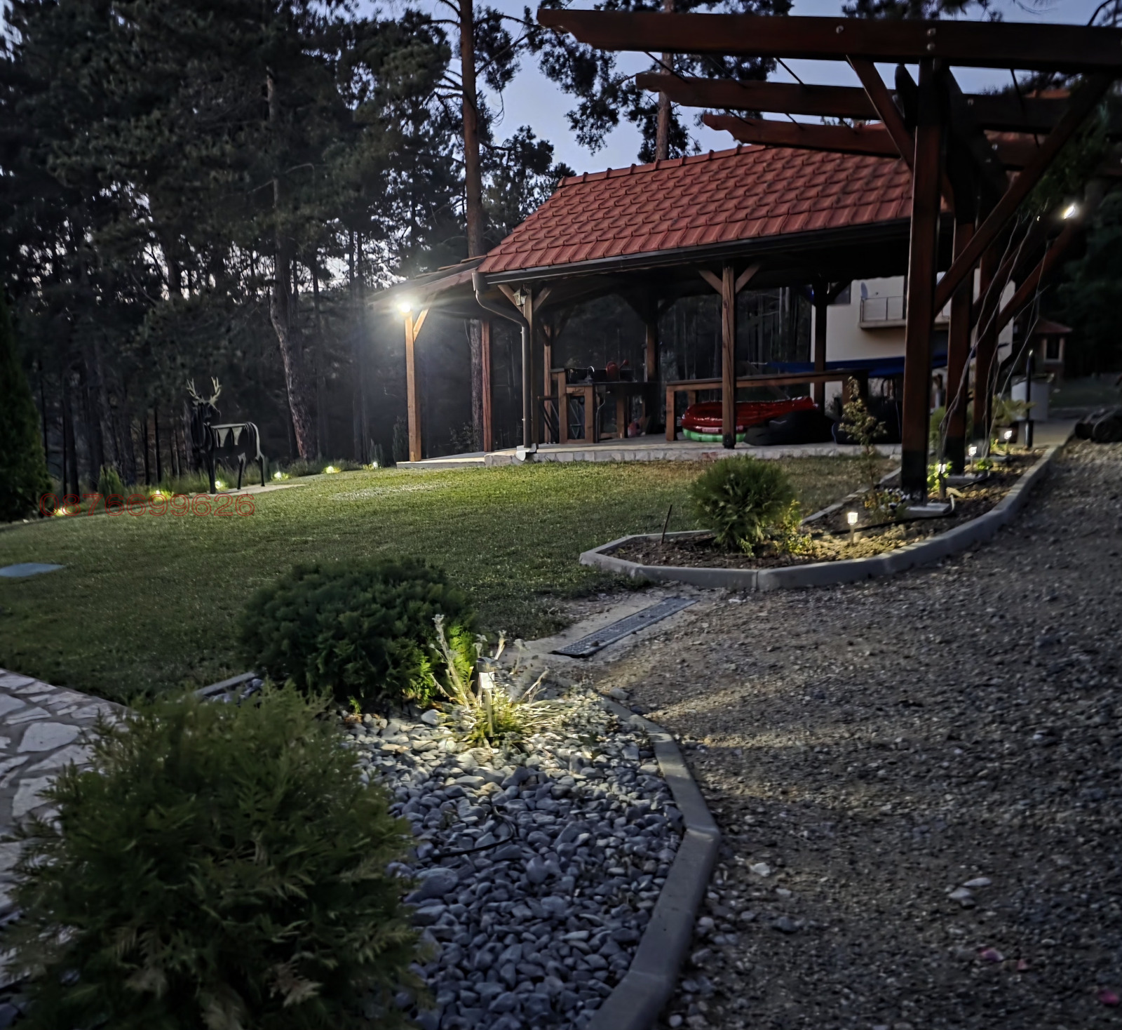 Дворът от 1451 квадратни метра е истински рай, включващ градини с рози, овощни дръвчета, детски кът и външна беседка с осветление и ветробранни завеси.