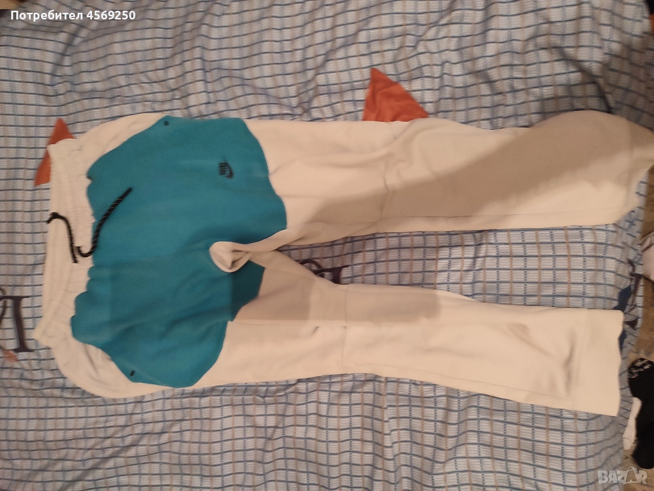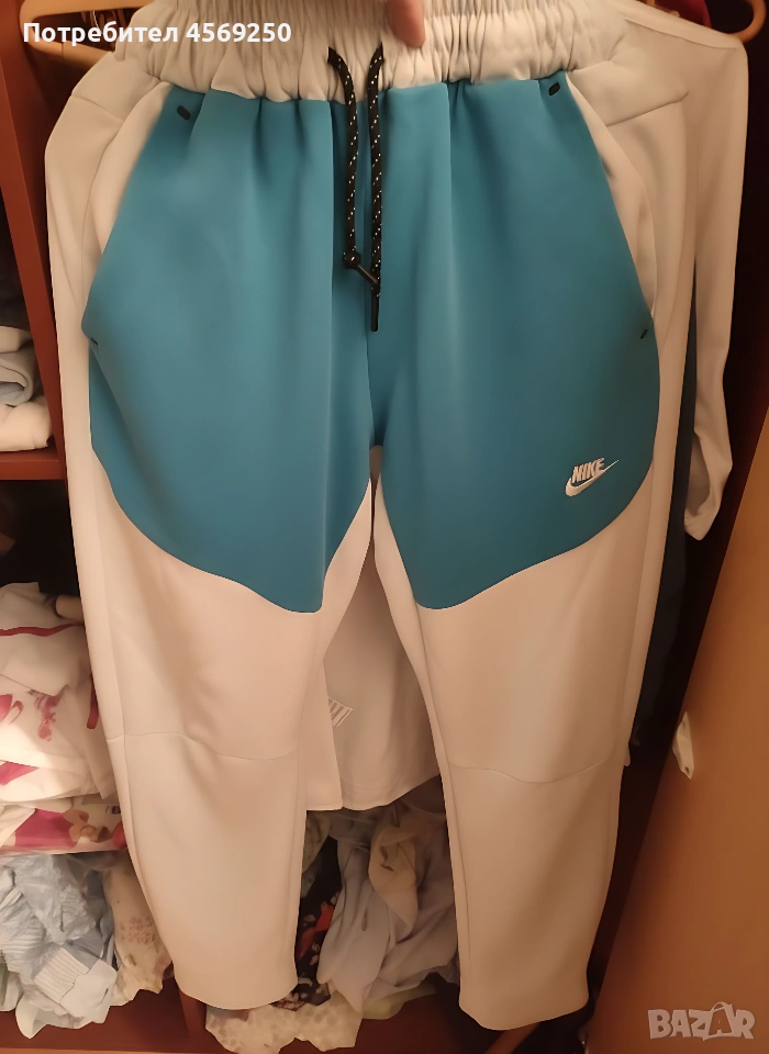 Продавам оригинален мъжки долнище Nike Tech Fleece в изключително атрактивна цветова комбинация (бяло и небесно синьо/тюркоаз). Панталонът е емблематичен за марката, съчетава стил и комфорт, и е идеален както за спорт, така и за ежедневието.