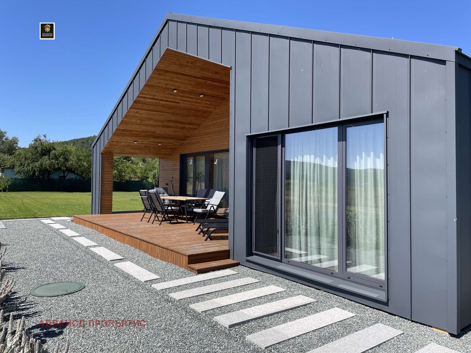 Разпределението на къщата е следното: гараж, антре с мокро помещение, коридор, дневна с кухня и трапезария, четири спални, две бани, веранда от естествен декинг.