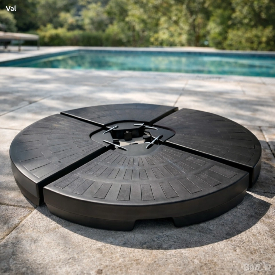 Брой части: 4 сегмента (модулна основа) Материал: UV-стабилизиран полиетилен/композит Централен адаптер: метален/подсилен пластмасов механизъм за захващане Финиш: антисмет и антихлъзгаща горна повърхност Съвместимост: повечето конзолни градински чадъри с диаметри на стойката в стандартни размери Транспорт и монтаж: модулна конструкция за лесно пренасяне и сглобяване без специални инструменти