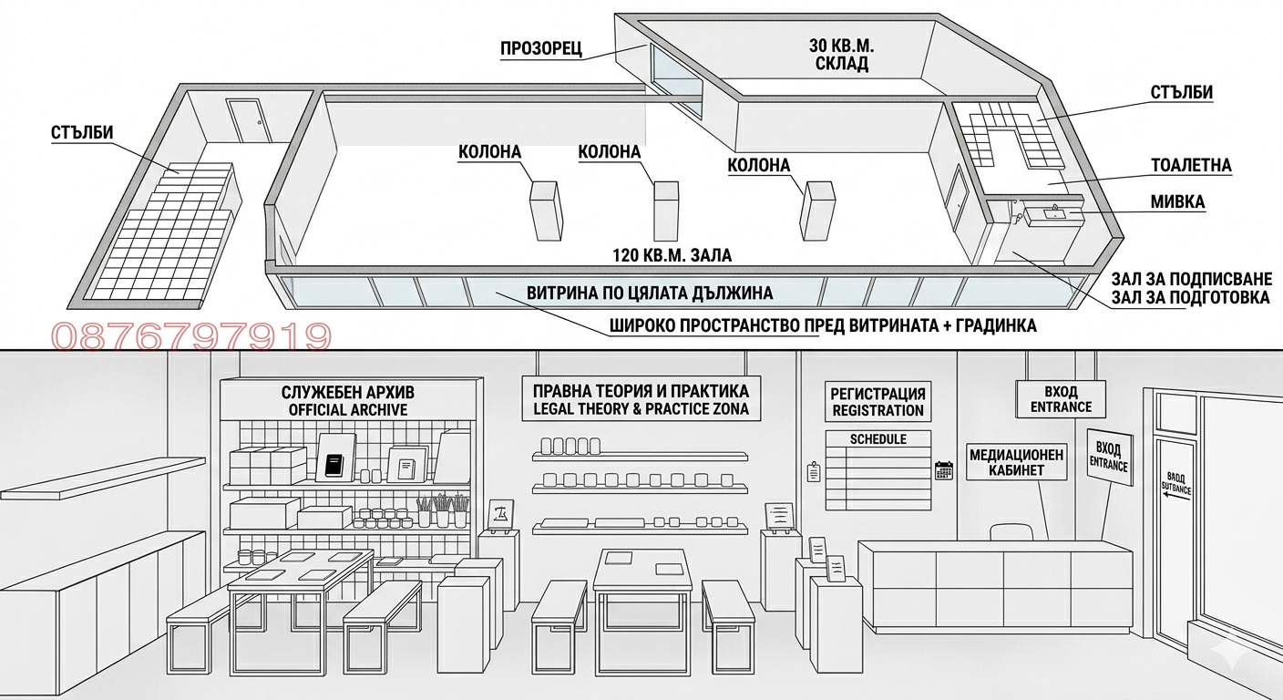 ЕКСКЛУЗИВНО: 150 кв.м до Съдебната палата | 15 м витрина | 3D концепции