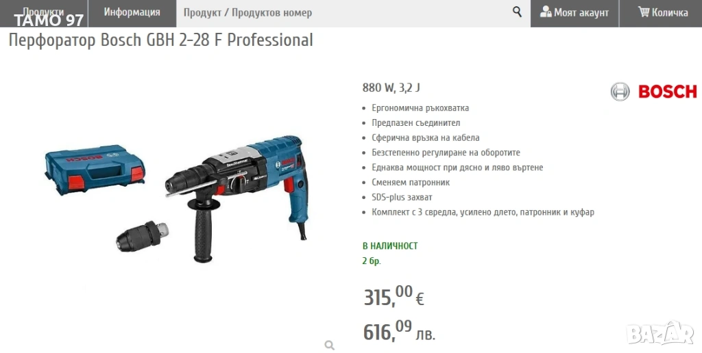 Продавам мощен перфоратор на Бош от синята професионална серия в отлично визуално състояние, както се вижда на снимките и работи перфектно. Машината е на 100% оригинален може и по серийния номер да се проверява, оригинално немско производство внос от Франция. Продава се така, както си е на снимките машината с ръкохватка, нов допълнителен патронник на бош за нормални свредла и оригинален куфар. Пращаме с опция преглед и тест с куриерска фира еконт може и лично предаване за гр. Шумен. Магазинската цена е: 315евро