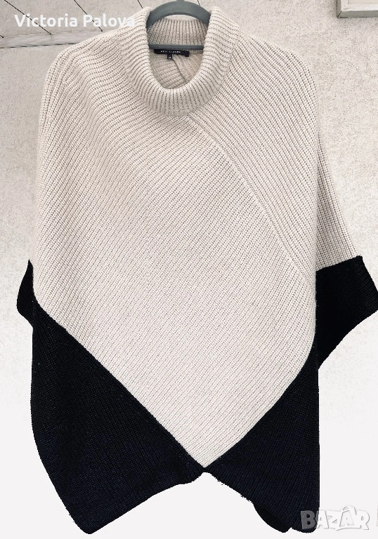 Луксозно дизайнерско пончо René Lezard – вълна и памук, асиметрия, черно/екрю