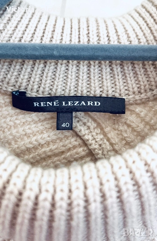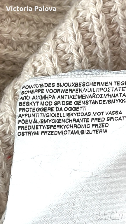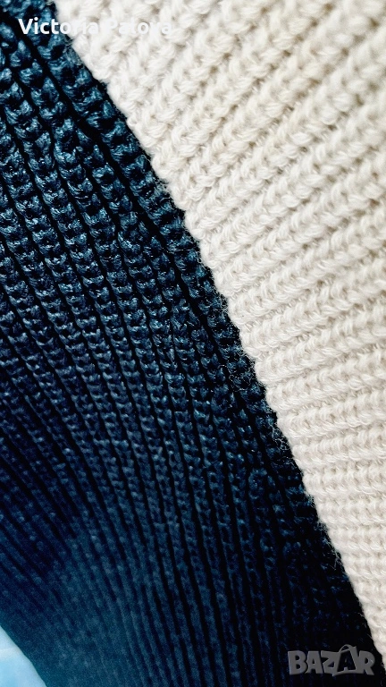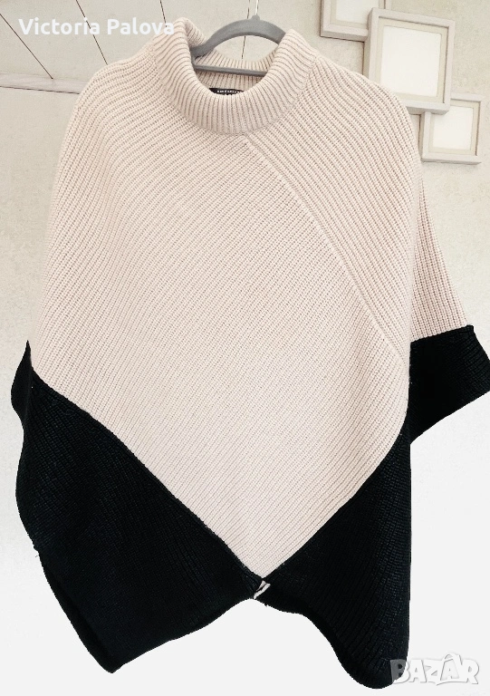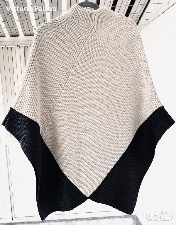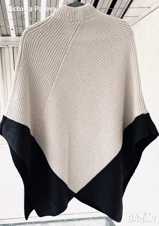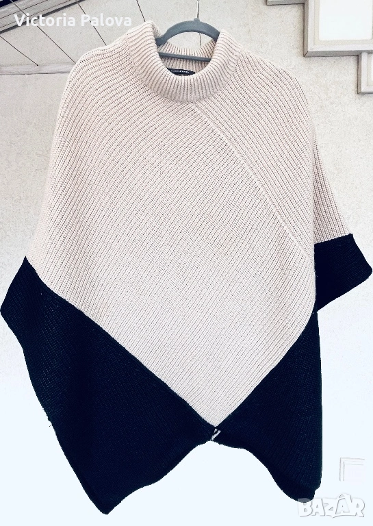 Уникално дизайнерско пончо от René Lezard – марка, известна с изчистената си естетика, високото качество и характерните, разпознаваеми силуети. Това не е обикновена плетка, а модел с архитектурно излъчване и ясно изразен дизайн. Кройката е асиметрична, с красиво падащи линии и различна дължина, което създава движение и прави дрехата изключително ефектна. Основният цвят е меко екрю, комбиниран с дълбоко черно в долната част. Черните панели са със специална обработка – с леко промазан, фино лъскав ефект, който придава дълбочина, тежест и много дискретен лукс. Материята е премиум смес – 57% вълна и 43% памук, което осигурява едновременно топлина, мекота и комфорт. Плетката е стабилна и плътна, стои красиво и много ефектно, като дизайнерско бутиково изделие. Размер: универсален (пада свободно).