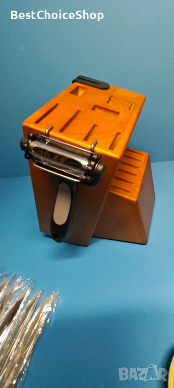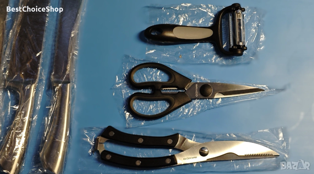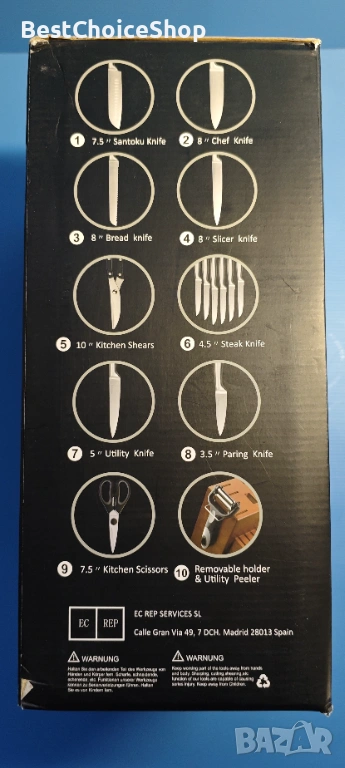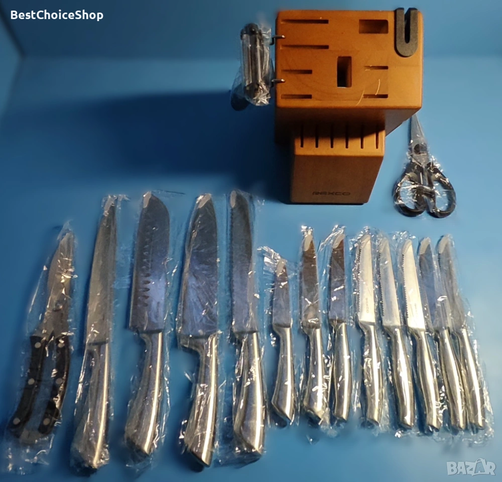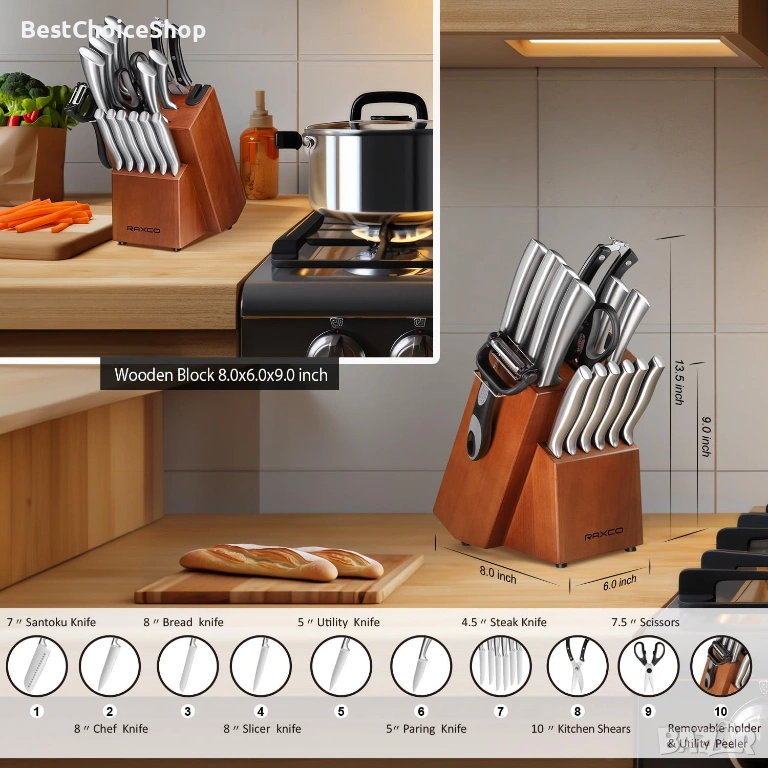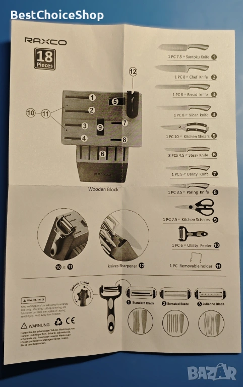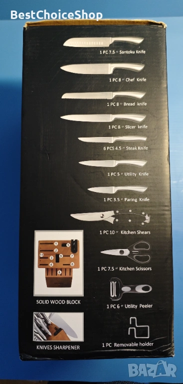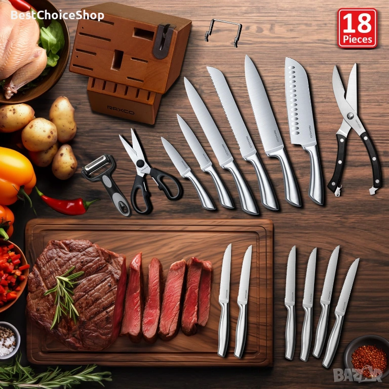 Комплектът кухненски ножове от 18 части включва: 12 броя ножове (включително 6 ножа за пържоли и 6 ножа за готвач), 1 x кухненска ножица, 1 x кухненска ножица, 1 x универсална белачка, 1 x подвижен държач, острилка за ножове и дървен блок.