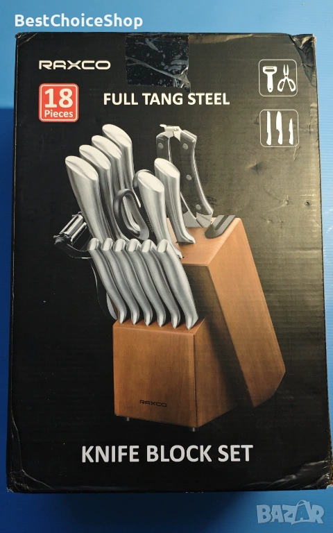 Комплект ножове RAXCO, 18-части с блок и точило, неръждаема стомана