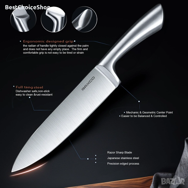 Стомана с пълно заоблени краища: за разлика от конвенционалните ножове, е изкована от едно парче. Лека за безпроблемна работа. Ножовете са перфектно балансирани според механичните принципи.